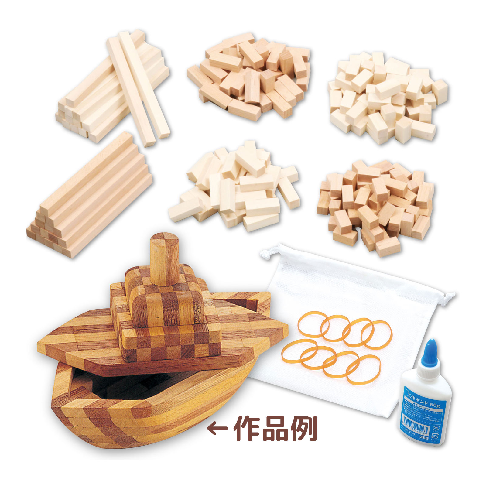 セット内容:木片、大(赤、白)各×15、木片、中(赤、白)各×40、木片、小(赤、白)各×60、輪ゴム×8、木工ボンド×1