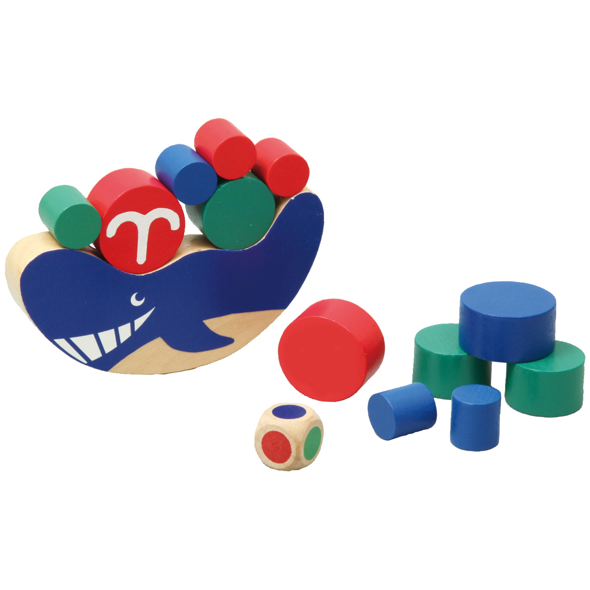 サイコロの色にしたがって、積み木をクジラの背中にのせよう!そーっとのせなきゃ落ちちゃうぞ!