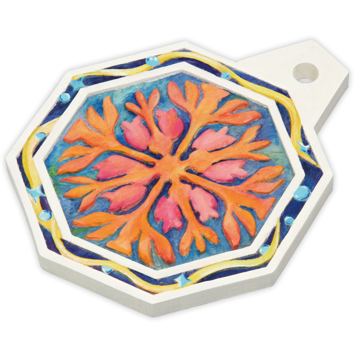 幸運を招く形として知られる、八角形の木彫なべしきです。