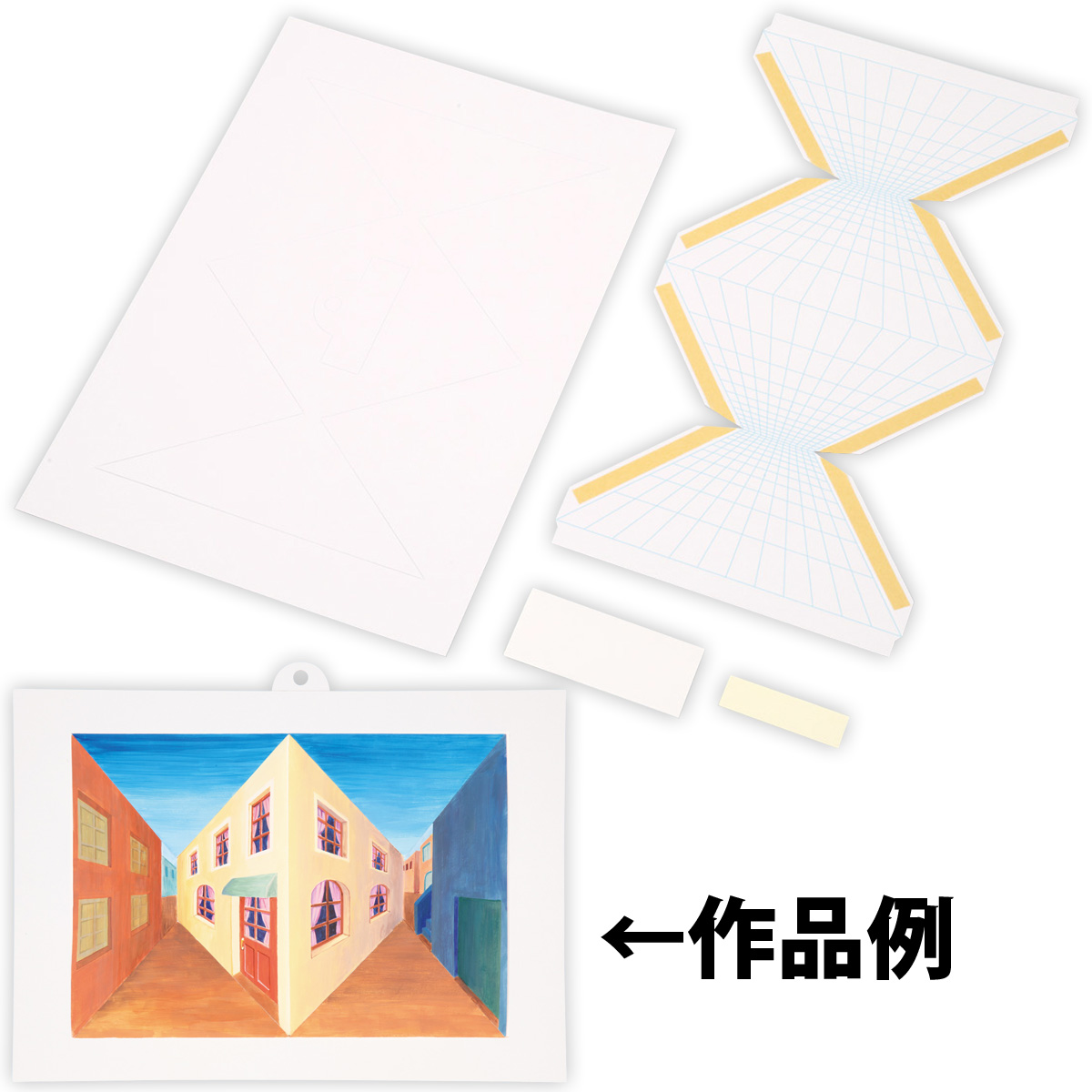 視点を変えると絵が動いて見える不思議な作品ができます。2点透視のガイド線を印刷しているので簡単に製作することができます。