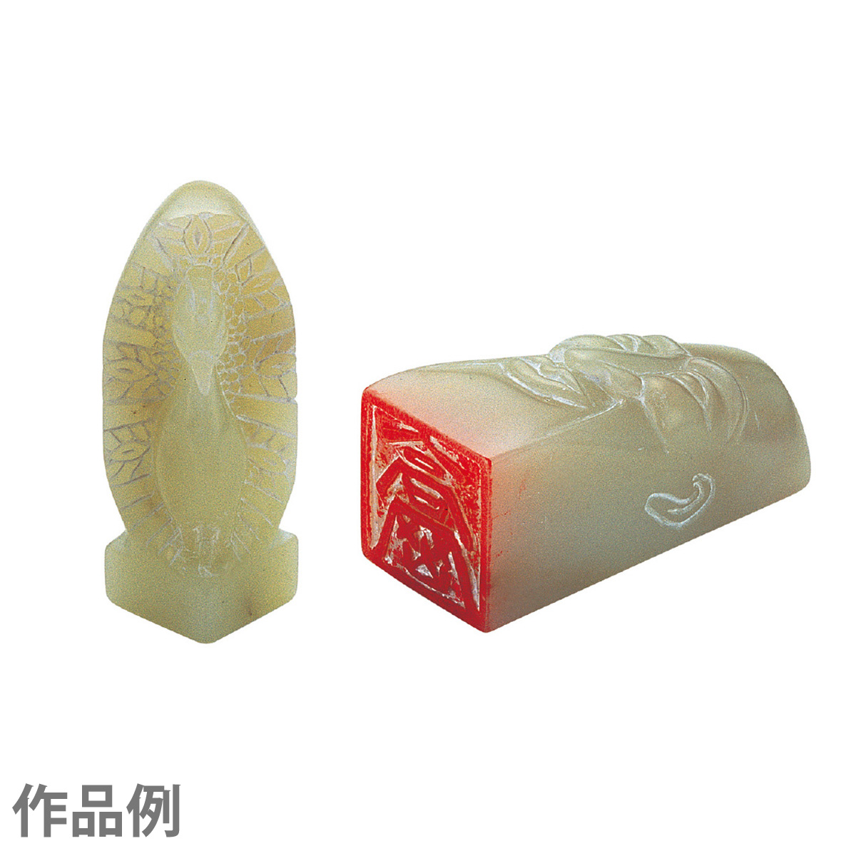 授業の合間の保管に便利!とてもやわらかい石です。てん刻に必要な材料がすべてセットされています。丈夫な箱に入っているため、保管に便利です。やすり付なので、持ち手部分の造形が容易です。サイズ:30×30×70mm/※天然石のため色、柄、サイズにバラつきがあります。