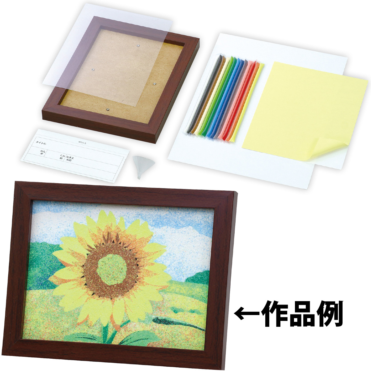 セット内容:砂絵用のり付シート×1、木目調フレーム×1、砂おとし用敷紙 A4×1、カラー砂13色組(4g×13本)×1、ミニジョウゴ×1、名前札×1