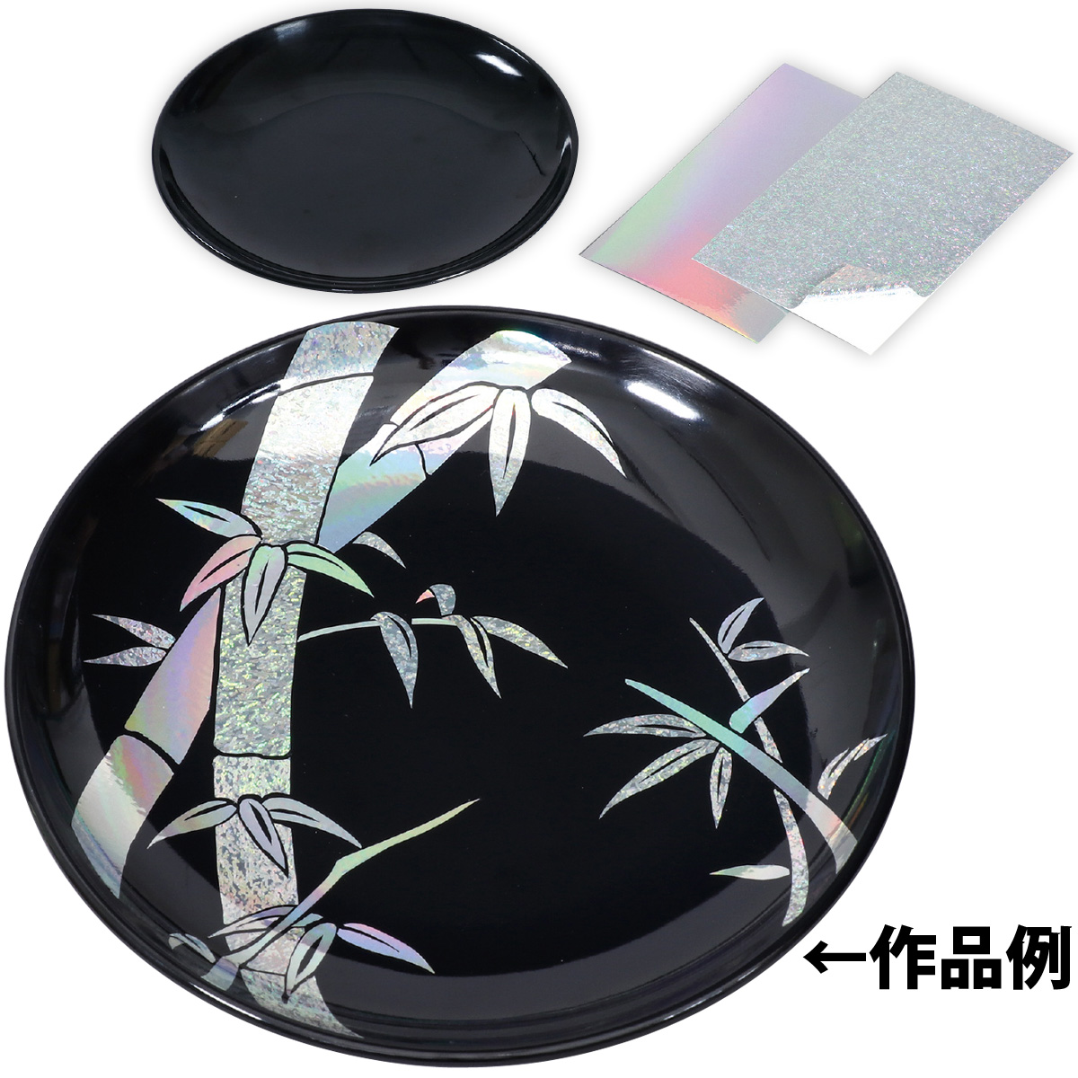 柄の違う2種類のらでん調シールを使って、らでん調のめいめい皿を作るセット。サイズ:φ150mm