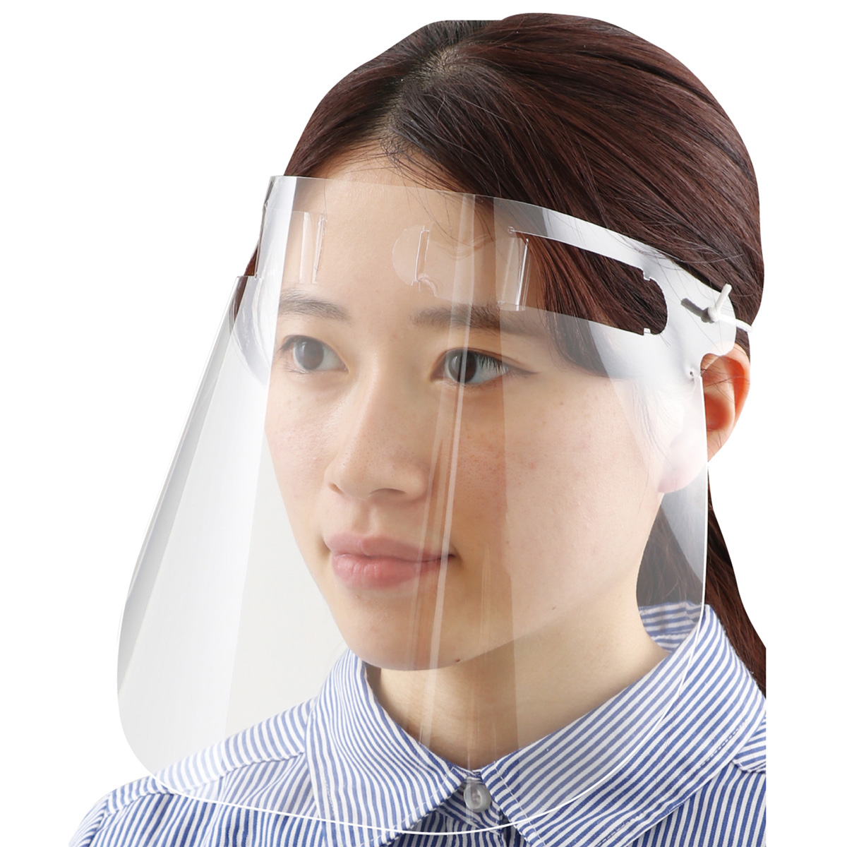 全面透明で目立たず蒸れない!額部分にスポンジがないので通気性抜群!0.2mm厚PET製。くもり止め加工。超軽量。紐取付済み。立体構造でしっかりフィット。ひっかけるだけで簡単にゴム紐の長さが調整可能です。水洗い・アルコール消毒OK。メガネをかけたままでもOK!両面保護フィルム付。商品サイズ:W330×H220mm