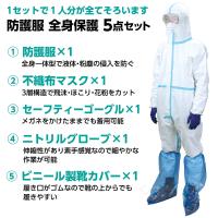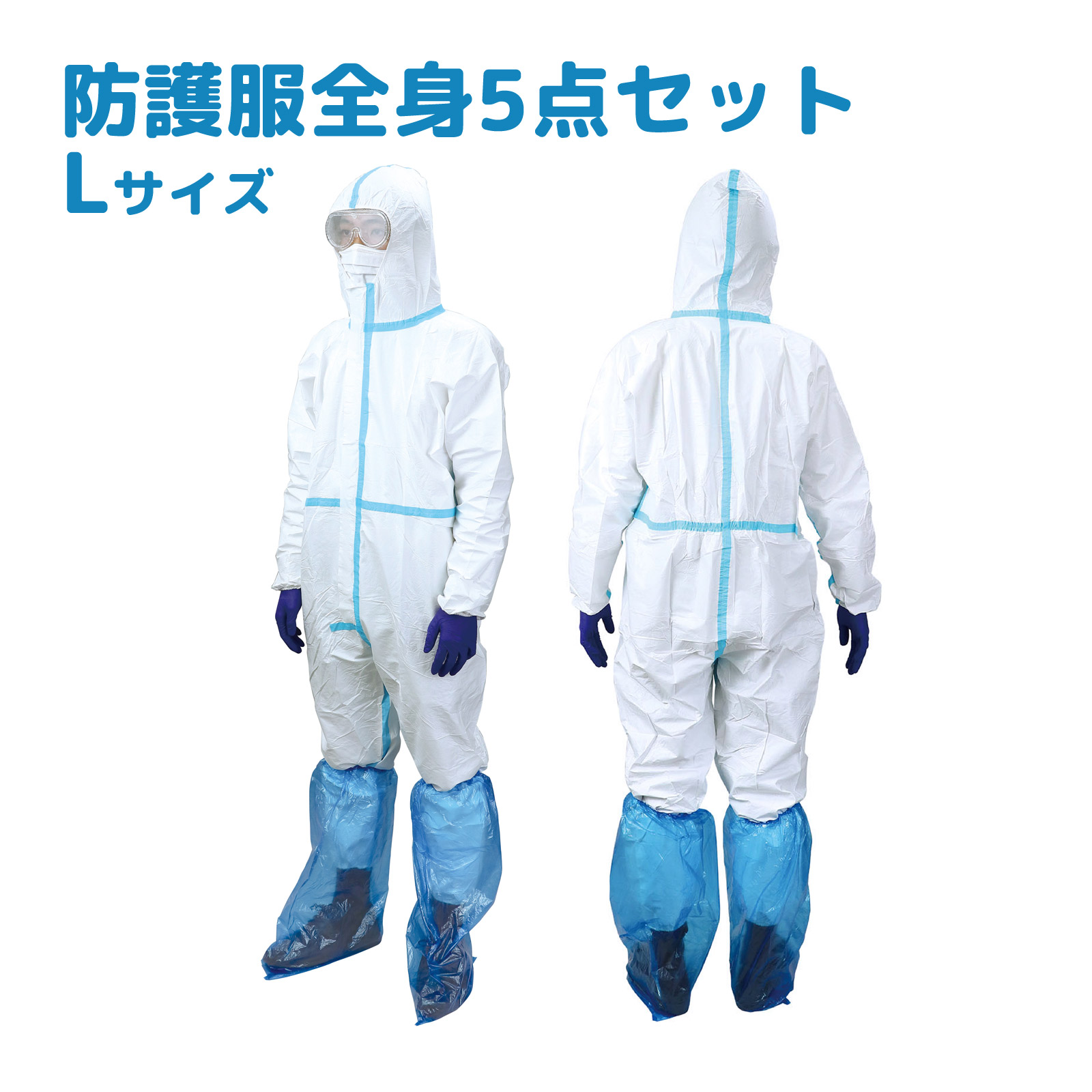 防護服 使い捨て 全身保護5点セットL 保護服 作業着 ウイルス対策 セーフティーゴーグル 保護メガネ 不織布マスク ニトリルグローブL 使い捨てビニ