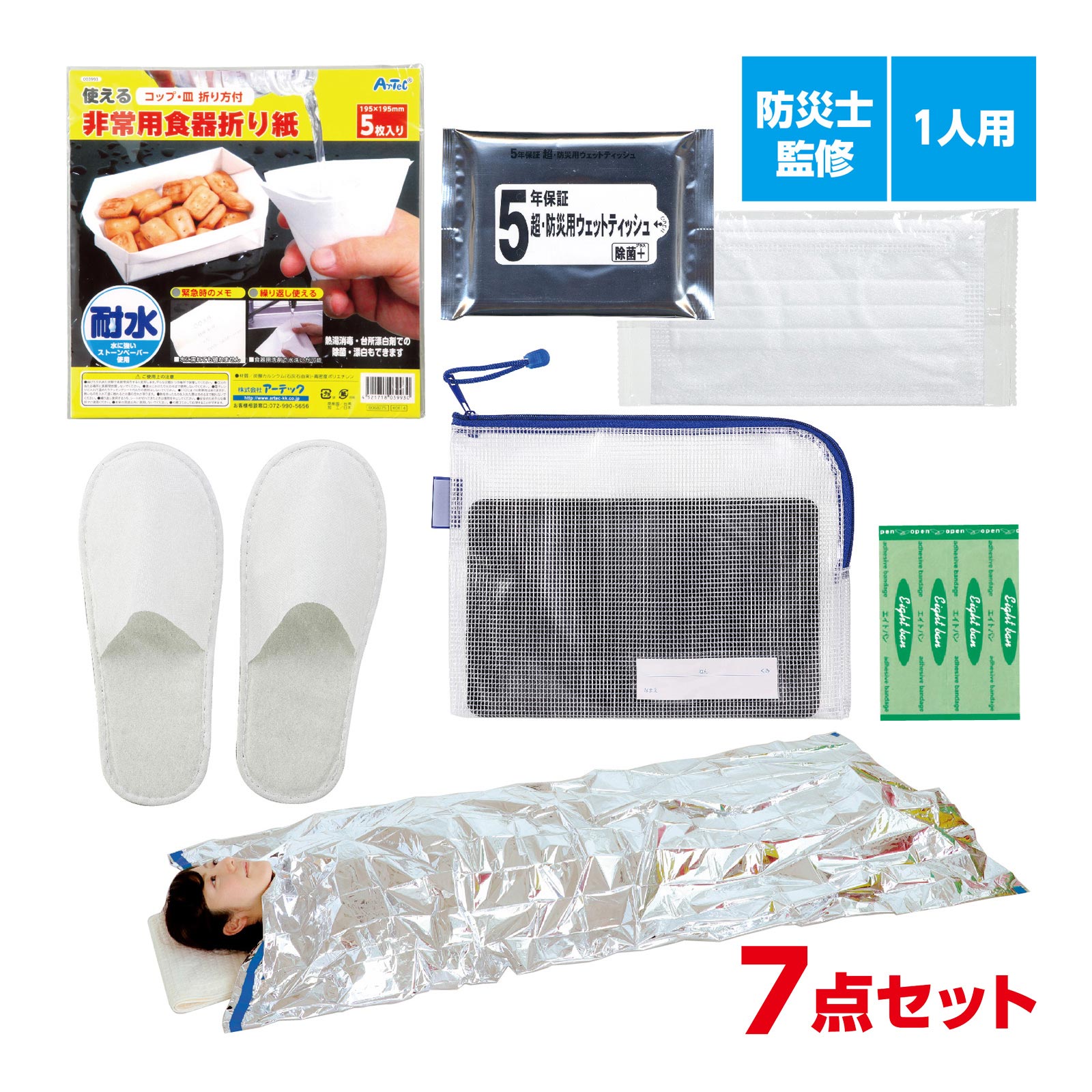 ■セット内容:マチ付連絡袋×1、ばんそうこう(2枚)×1、非常用食器折り紙×1、不織布マスク×1、非常用アルミ防寒寝袋×1、不織布スリッパ×1組、防災用ウェットティッシュ×1
