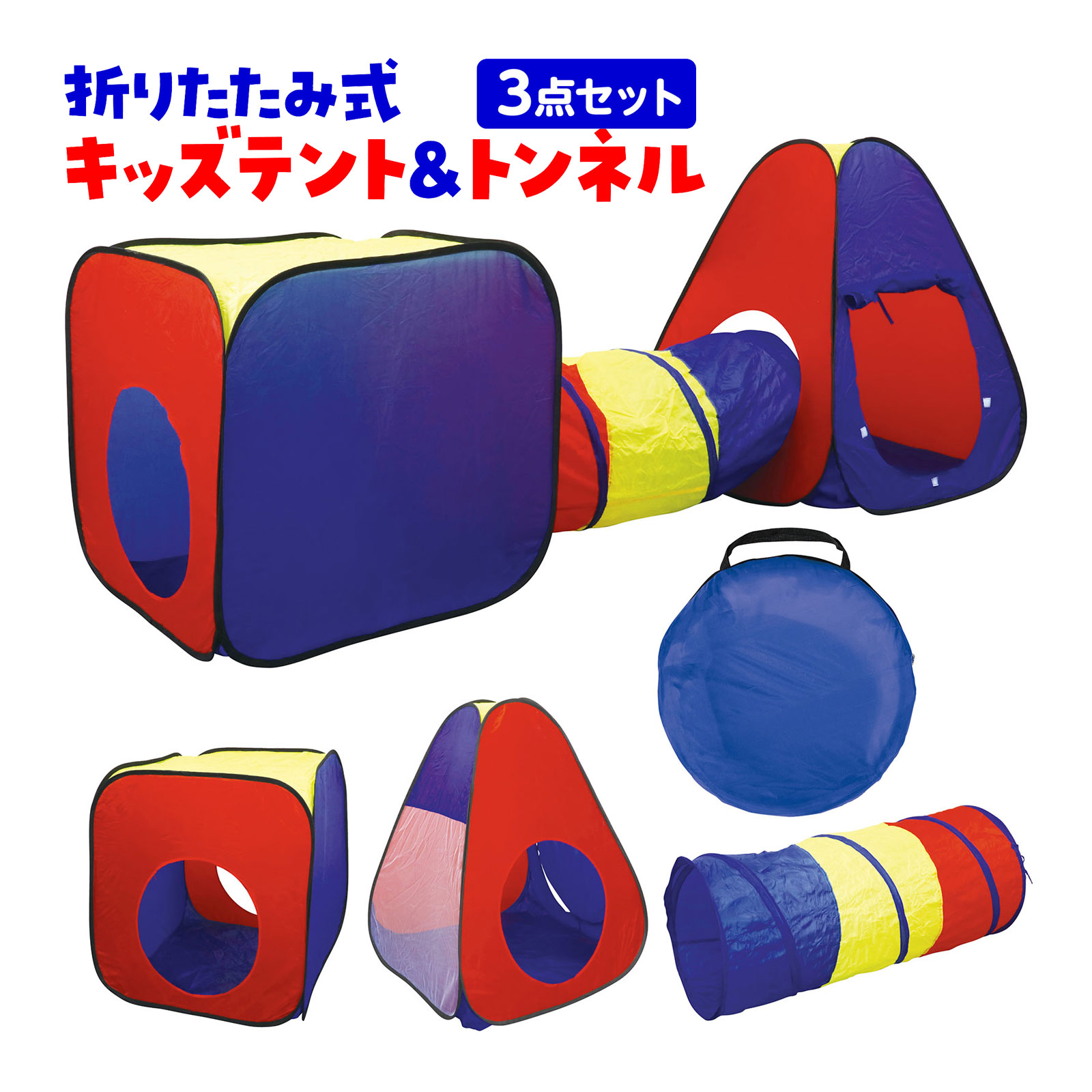 連結でも単体でも遊べる!三角テント、四角テント、トンネルの3点セット。商品サイズ:テント/775×775×980mm、キューブ/775×775×775mm、トンネル/φ460×1090mm