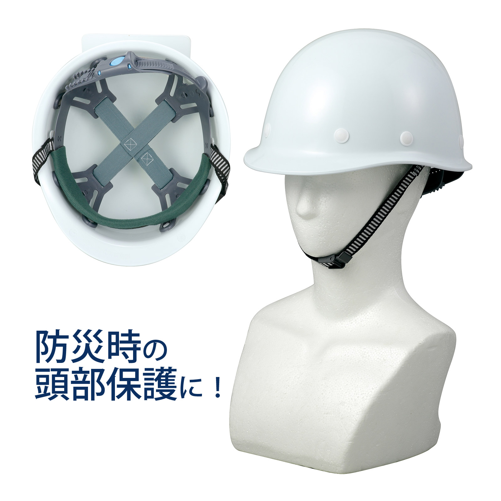 防災時の頭部保護を目的としたシンプル設計のヘルメットです。軽量で装着しやすく、頭囲55〜60cmまで調整可能なアジャスター付きで、安定した装着感を実現しています。家庭や職場、学校などの防災備蓄用として常備しやすく、いざという時にすぐ使える安心設計です。日常の防災対策から避難時の安全確保まで、基本装備としておすすめのヘルメットです。※注意:この商品は頭部の保護のみを目的としています。原動機付自転車や自動二輪車には使用しないでください。使用する際には必ず点検を行い、故障や破損など異常がないかご確認ください。異常が見られた場合は絶対に使用しないでください。ヘルメットが一度でも大きな衝撃を受けた場合、着用しないでください。安全性が低下する可能性があります。ヘルメットを長時間直射日光に当てたり、50℃以上の高温な場所に置いたりしないでください。製品の変形や安全性が損なわれる恐れがあります。ヘルメットは構造上、複数の隙間があります。指を入れるとケガをする恐れがあるため、ご注意ください。