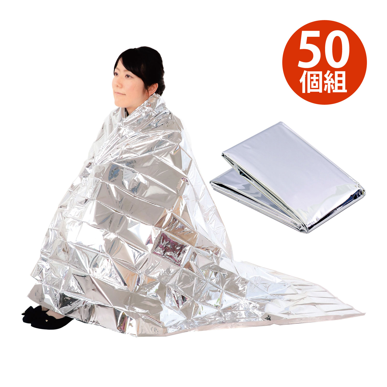 災害時などの簡易防寒具として便利なアルミ素材の防寒シートです。家族全員で使える多目的シートタイプです。反射することで体を温め、雨や風に体温を奪われることを防ぎます。たためばコンパクトになるので、防災リュックに入れたり、アウトドアにも便利です。銀色でキラキラ目立つので、救出時の発見に役立ちます。50個入りなので、ご家庭、オフィス、避難所やイベント用の備蓄にも十分対応。防災用品やアウトドアグッズとして、ぜひ常備しておきたいアイテムです。