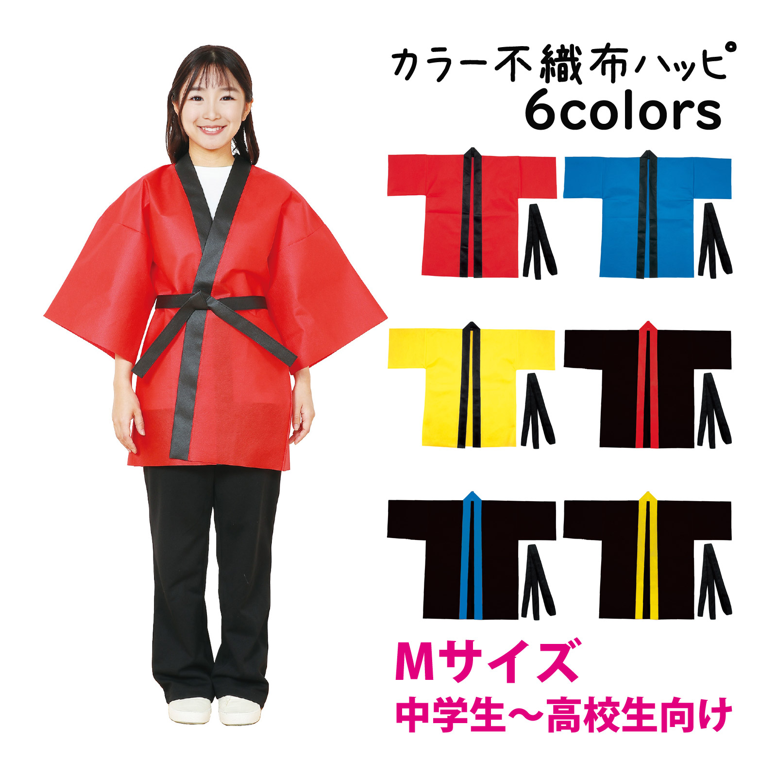 カラー豊富!軽くて丈夫な不織布ハッピ!安くて丈夫なハッピです。軽さと撥水性を持ち合わせた不織布製です。カラーが豊富なので、クラスやチーム、グループごとに色分けできます。帯付きなので、しっかりと着用可能です。不織布なので加工が簡単です。中学生〜高校生向けのサイズです。運動会、発表会、イベントなど幅広いシーンで使えます。