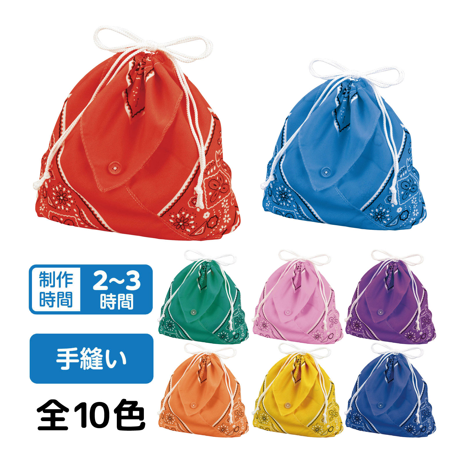 手縫いの練習にぴったり!初心者でも安心して楽しめるバンダナ巾着キット!バンダナでつくる、マチ付き巾着の手芸キットです。布をカットする必要がなく、すぐに作り始められるので初心者さんにも安心。製作時間の目安は約2〜3時間です。ボタン付けや直線縫い(ミシン縫い)などの基礎を学べるので、裁縫の入門にもぴったり。気軽にハンドメイドを楽しみながら、実用的なアイテムを作ることができます。完成後はマチ付きで使いやすく、給食袋やお弁当袋、小物入れなど幅広く活躍します。