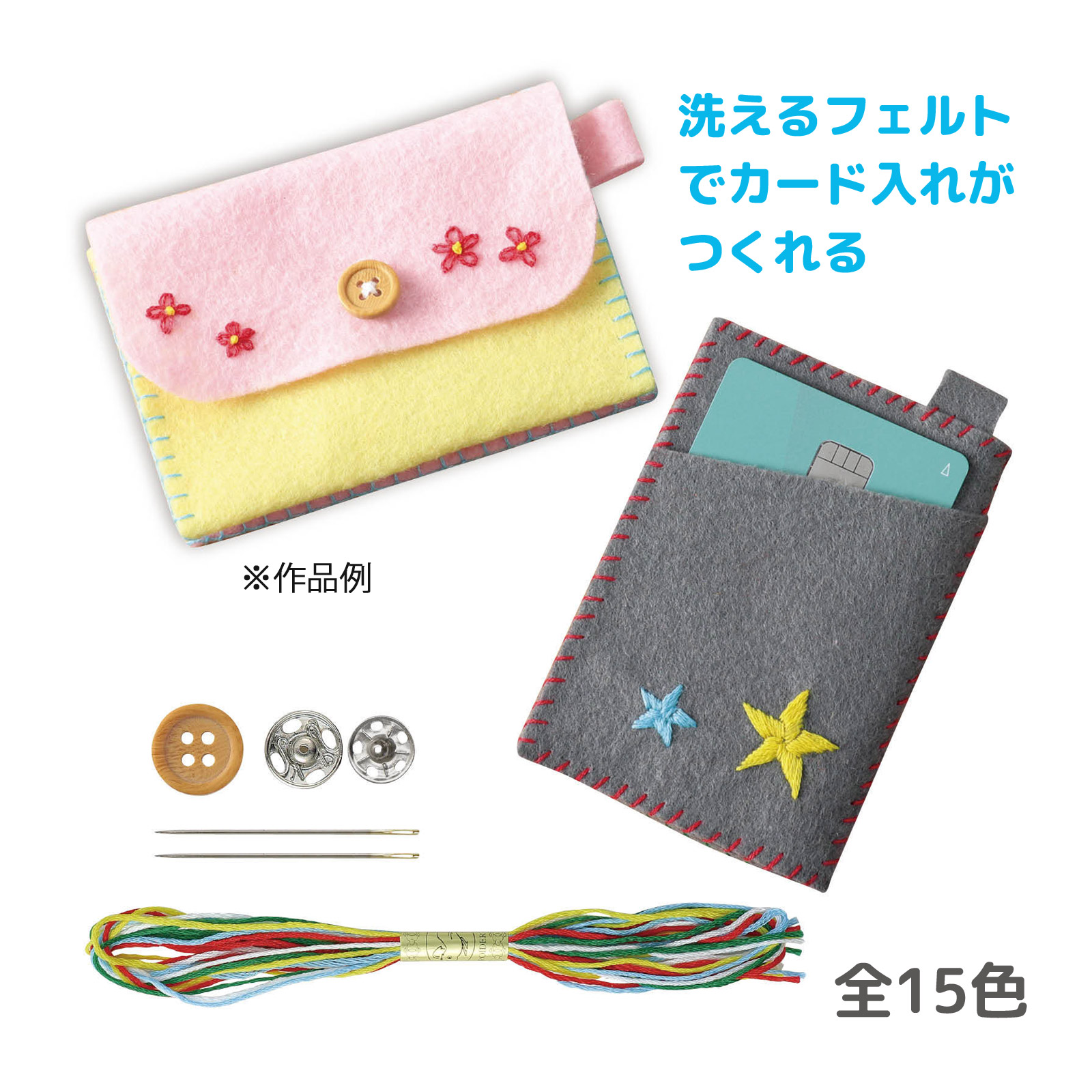 洗えるフェルトで長く使える!手作りカードケースキット!洗えるフェルトでつくる、カード入れの手芸キットです。ジャバラポケット2つとスライドポケット1つ、合計3つのポケット付きで収納力も抜群。便利で実用的なカード入れが完成します。フェルトを分けて2色の作品を作ったり、刺しゅうや色選びで自分だけのオリジナルデザインに仕上げたりできるのも魅力。針と糸がセットになっているので、裁縫初心者さんでも安心して始められます。制作時間の目安は約3〜5時間。刺しゅうステッチの練習にもぴったりで、気軽にハンドメイドを楽しめます。完成後は名刺入れやICカードケースとして、毎日の生活で長く活躍してくれます。