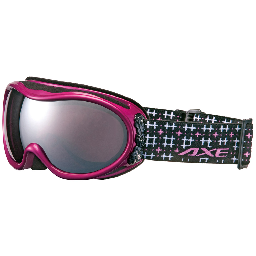 AXEスキー・スノボーゴーグル。曇り止め機能付き。メガネ・ヘルメット対応。女性にフィットするコンパクトサイズ。サイドに付いたバラのモチーフと、キラッと光るラインストーンがアクセント。
