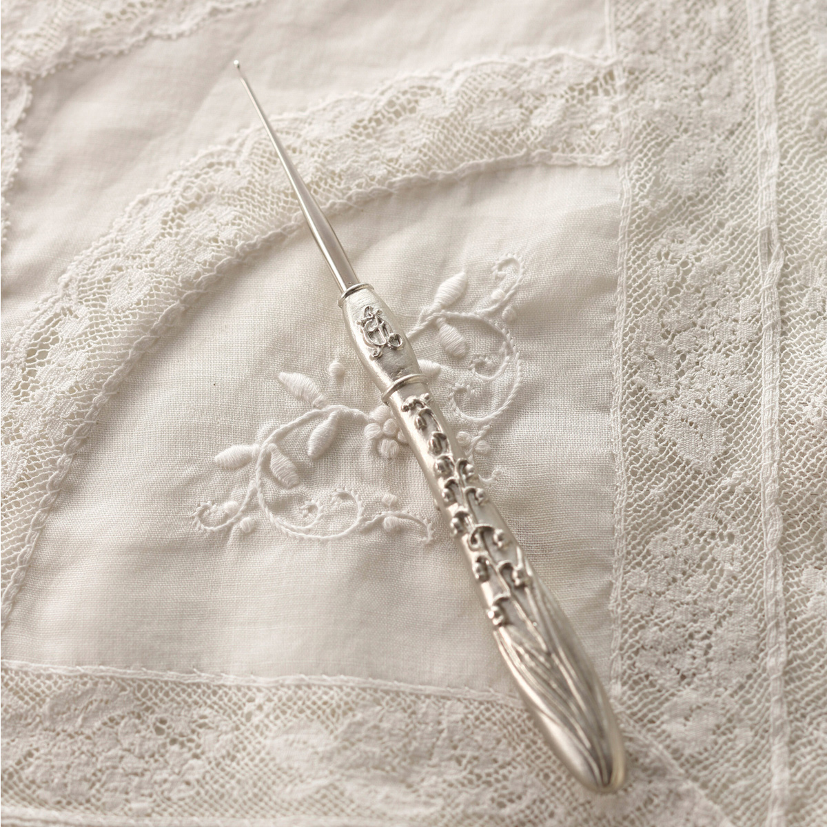 熟練の職人が手づくりした錫(すず)のお裁縫道具。PorteBonheur(ポルトボヌール)とはフランス語で『幸せが訪れる』という意味。人気雑貨アーティストAnano"さん、新しい伝統工芸の魅力を伝える能作さん、お裁縫道具の有名メーカー、クロバーさんとのコラボレーションによって生まれた, 錫製のレース針です。純度100%の錫(スズ)製です。錫は金・銀の次ぐ高価な金属で、抗菌作用が強く金属アレルギーになりにくい素材のため、古くから食器や器に使用されていました。『幸福の訪れ(再来)』という花言葉を持つすずらん。フランスでは5月1日、大切な人にすずらんを贈る習慣があります。そんなすずらんをモチーフにした素敵なお裁縫道具です。