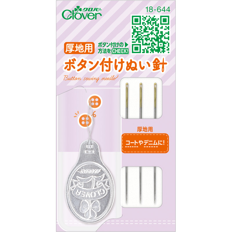 コートなどの厚地のボタン付けに便利な針セットです。パッケージのQRコードを読み取って、ボタン付けや補修の動画や画像を見ることができます