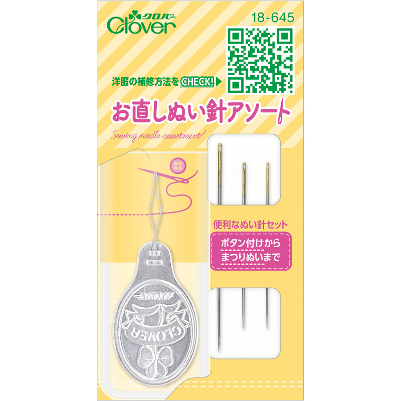 ボタン付けからまつりぬいまで、お直しに便利なぬい針セットです。パッケージのQRコードを読み取って、ボタン付けや補修の動画や画像を見ることができます