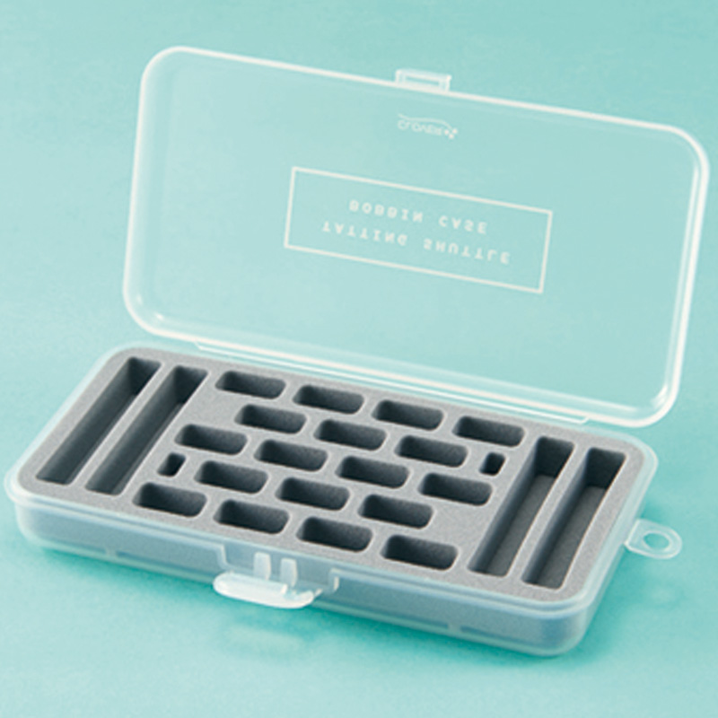タティングシャトル・ボビンの保管・持ち運びに。"タティングシャトル・ボビン"のシャトルやボビン、ストッパーが収納できるケースです。スポンジが糸をホールドするので、糸がほどけず、絡みにくい!透明なケースなので、巻いている糸が一目で分かります。【収納できるもの】・タティングシャトル・ボビン・ストッパー・ワッシャー