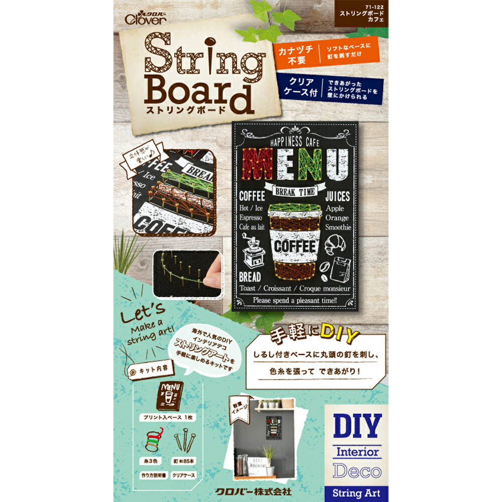 釘に色糸を張って様々なデザインを表現する「ストリングボード」はアメリカなど海外で人気があるDIYインテリアデコレーションです。このキットはフォームベースに釘を刺し、糸を張るだけでおしゃれなストリングボードが簡単に作れるオールインワンキットです。完成したボードは付属のクリアケースに入れて壁面の飾れます。インテリアDIYデコが手軽に楽しめます。ストリングボードはソフトなベースに釘を刺して色糸を張るだけの簡単テクニックで、おしゃれなストリングアートが楽しめるオールインワンキット。海外で人気です。ソフトなフォームベースだから、指で押すだけで釘が刺せ、カナヅチは不要です。プリント入ベースタイプは、ベースにプリントしてある「しるし」に合わせて釘を刺して、色糸を張るとボードが完成します。プリント入りでチョークアート風のアートが映え、早く作れます。定規またはメジャー、はさみ(糸を切るため)