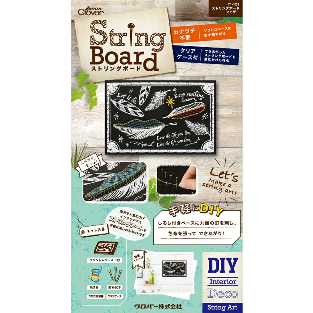 釘に色糸を張って様々なデザインを表現する「ストリングボード」はアメリカなど海外で人気があるDIYインテリアデコレーションです。このキットはフォームベースに釘を刺し、糸を張るだけでおしゃれなストリングボードが簡単に作れるオールインワンキットです。完成したボードは付属のクリアケースに入れて壁面の飾れます。インテリアDIYデコが手軽に楽しめます。ストリングボードはソフトなベースに釘を刺して色糸を張るだけの簡単テクニックで、おしゃれなストリングアートが楽しめるオールインワンキット。海外で人気です。ソフトなフォームベースだから、指で押すだけで釘が刺せ、カナヅチは不要です。プリント入ベースタイプは、ベースにプリントしてある「しるし」に合わせて釘を刺して、色糸を張るとボードが完成します。プリント入りでチョークアート風のアートが映え、早く作れます。定規またはメジャー、はさみ(糸を切るため)