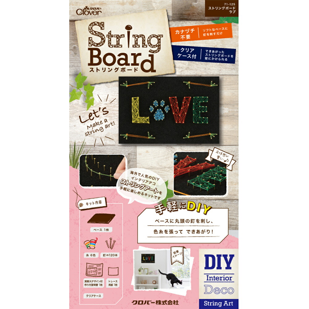 釘に色糸を張って様々なデザインを表現する「ストリングボード」はアメリカなど海外で人気があるDIYインテリアデコレーションです。。このキットはフォームベースに釘を刺し、糸を張るだけでおしゃれなストリングボードが簡単に作れるオールインワンキットです。完成したボードは付属のクリアケースに入れて壁面の飾れます。