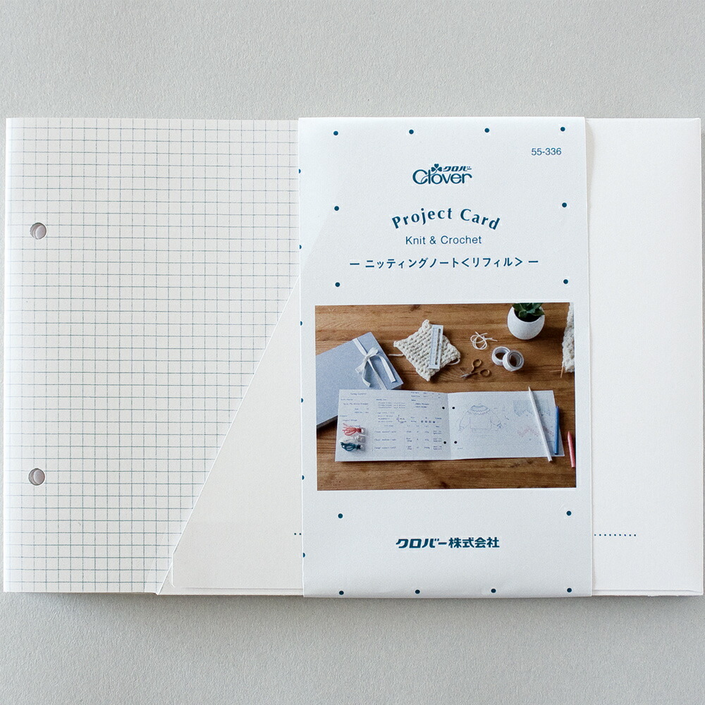 追加用のプロジェクトカード。使用した編み針、道具、糸、参考書籍、作品寸法、アレンジした箇所についてのメモなど、作品についての情報を記録する専用のプロジェクトカードです。見開きタイプなので、作品についての情報を一目で確認する事ができます。ポケット付で、毛糸のラベルや編み図を一緒に保管できて便利です。ニッティングノート(55-355)の追加用としてお使いください。