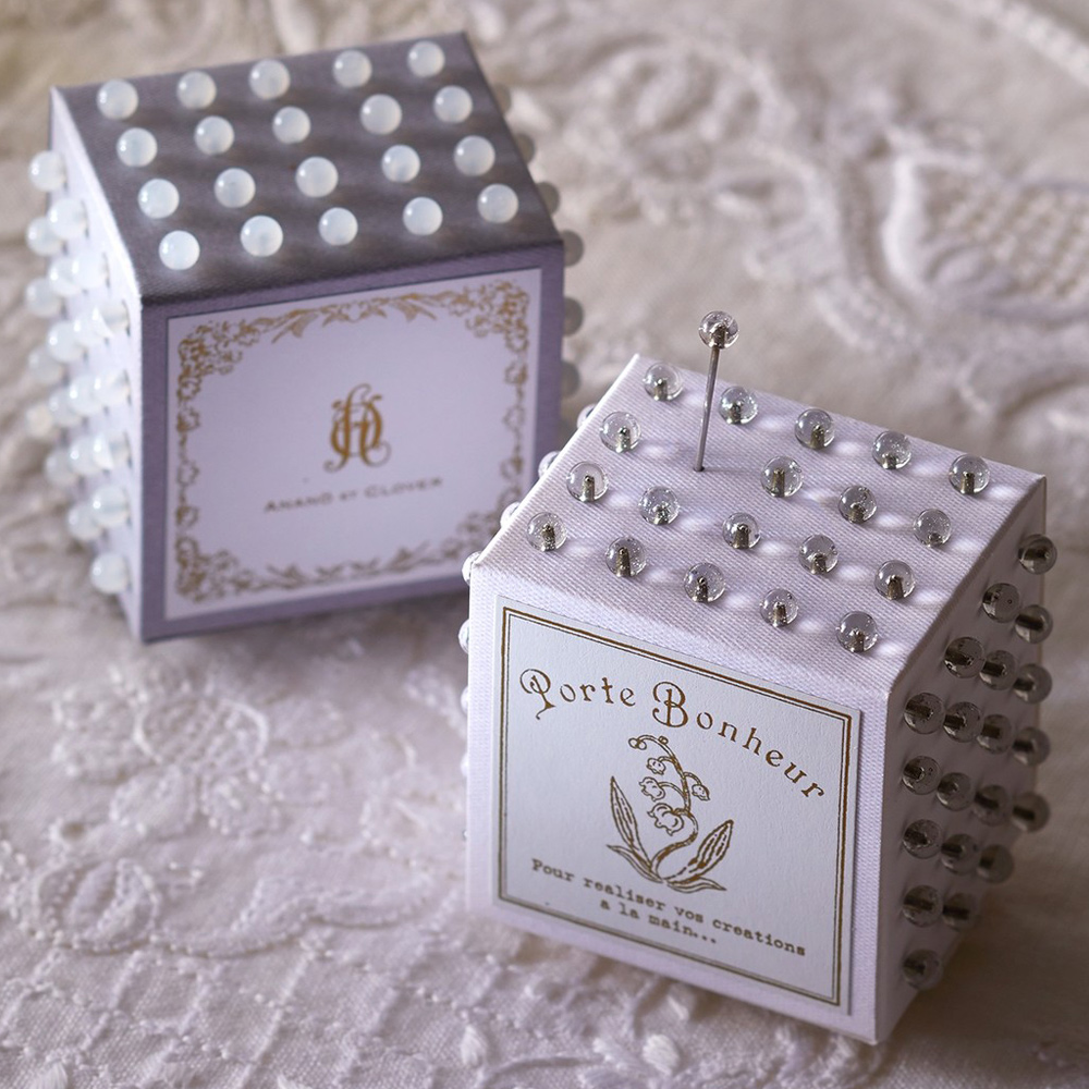 紙のキューブに待針を刺したユニークなパッケージ。Anano(溝江里映)による清楚なデザインの待針。紙のキューブに待針を刺したユニークなパッケージ。キューブ2個入りで、ひとつのキューブに待針が80本入っています。