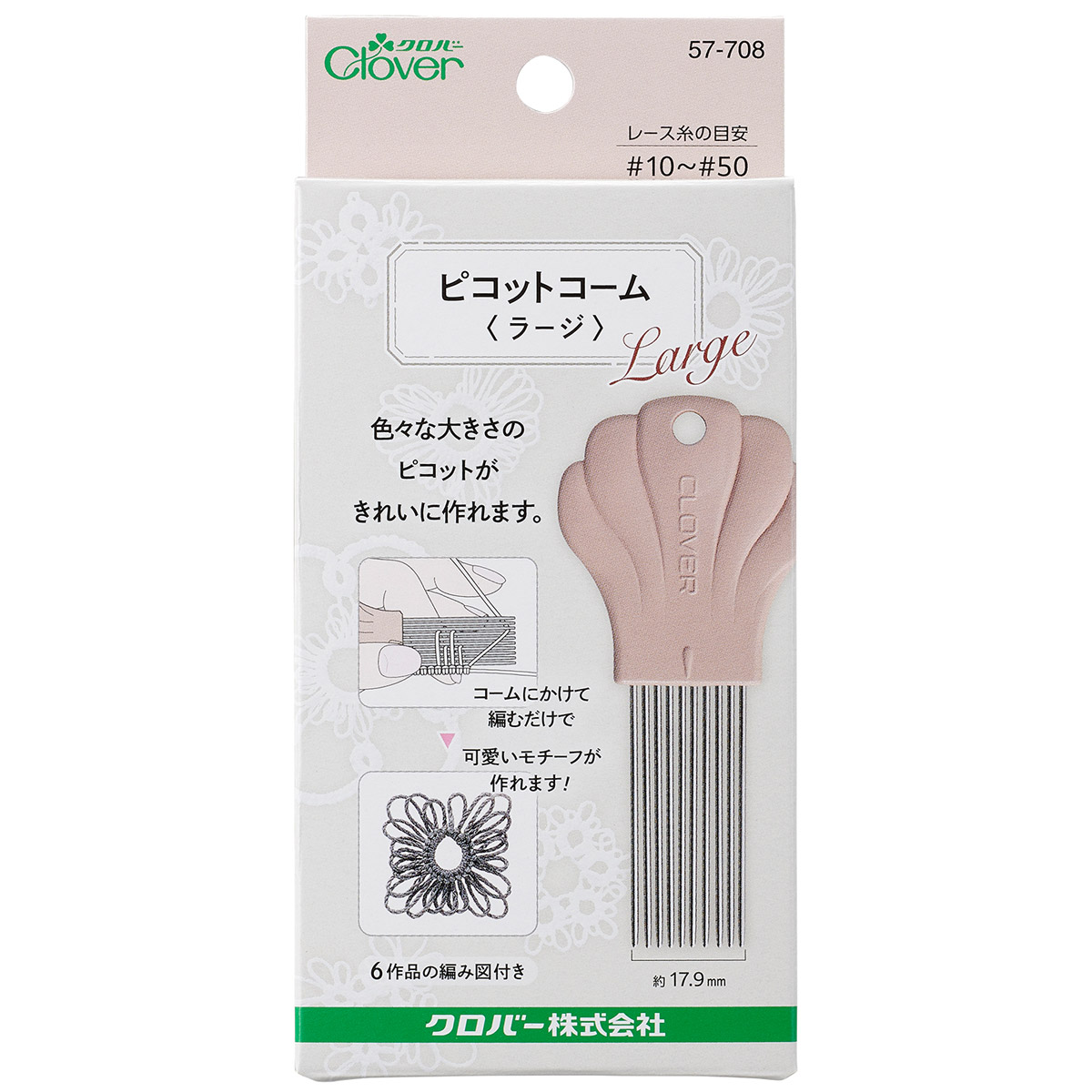 色々な大きさのピコットがきれいに作れます。タティングレースのピコットの大きさを揃えて作るためのツールです。コームに糸をかけて編むだけで可愛いモチーフがきれいに作れます。6作品の編み図付き。ピコットは10段階の高さで作れます。〈ラージ〉は、約1.2〜17.9mmの高さです。糸をかける部分がくし状なので、大きさの異なる複数のピコットを連続して作ることができます。使用する糸の太さに合わせて、ピコットコームをお選びください。〈ラージ〉は、太めのレース糸(#10〜#50)です。使い方は、左手にかかっている糸を、手前側からコームにかけます。表目を編み、1つ前の目の横まで寄せてから、裏目を編みます。※結び具合により変化します。適したレース糸の太さ(目安)⇒太めのレース糸(#10〜50)