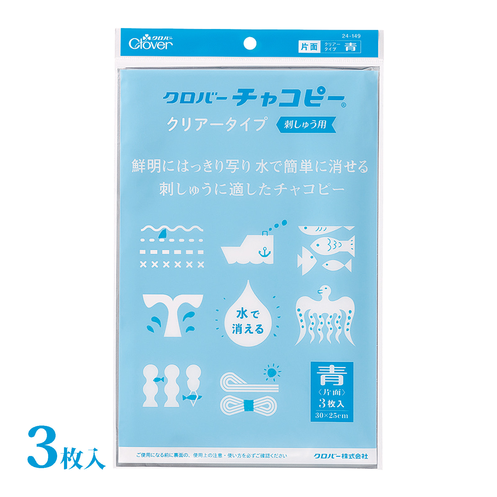 水で消える!便利なクリアータイプの転写紙。刺しゅう用。筆圧の弱い方でも鮮明に写る。霧吹きなどの少量の水で簡単に印が消せる。※濃色生地では印が見えにくいので、チャコピー刺しゅう用片面白をお使いください。保管上の注意:チャコピークリアタイプのインクは、光や湿気により退色するので、使用後は、本体が入っていた銀色の袋に戻し、袋口をテープで止めてから保管してください。
