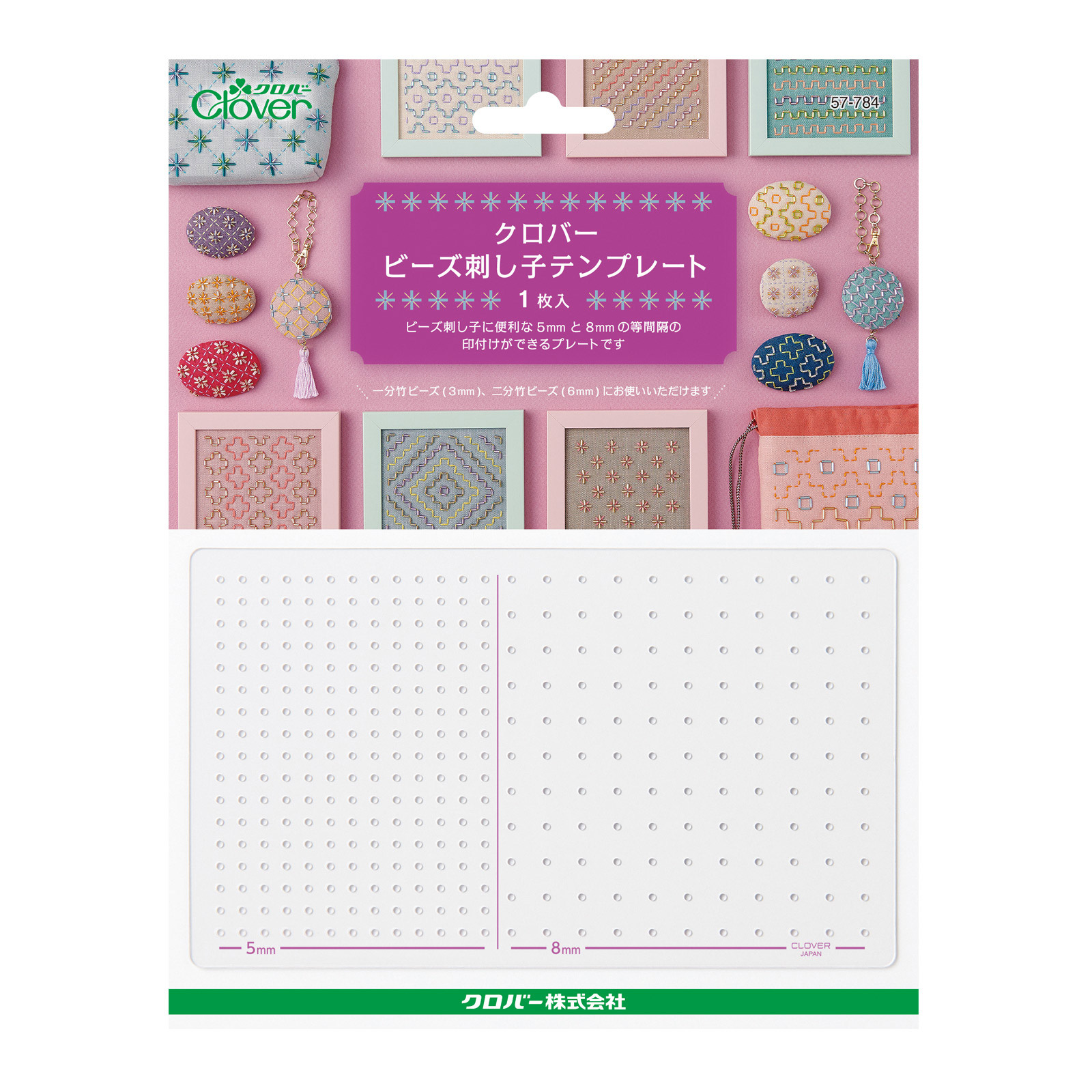 テンプレートで「ビーズ刺し子」のしるしが簡単に付けられます。ビーズ刺し子のステッチの前に正確な印を付けるためのプレートです。5mm幅は一分竹ビーズ(3mm)、8mm幅は二分竹ビーズ(6mm)のしるし付けに使うことが出来ます。ドットが正確に付けられるので、作品もきれいに仕上がります。ブローチやポーチ、オーナメント作りはもちろん、洋服やバッグ、小物など既製品のアレンジも楽しめます。9種類のステッチ説明入り平山道(ひらやまみち)、矢羽根(やばね)、段つなぎ、柿の花、角十つなぎ(かくじゅう)、十の木(じゅうのき)、米刺し、蜀紅(しょっこう)、銭形刺し(ぜにがた)用意するものビーズお好みの生地(キャンバス地など)ビーズ 5mmの間隔を使う時/一分竹ビーズ(3mm) 8mmの間隔を使う時/二分竹ビーズ(6mm)水性チャコペン25番刺しゅう糸 または 刺し子糸〈細〉クロバービーズ刺し子針〈6本入〉(57-785)スレダー(15-001)消しペン(水性チャコペン用)(24-425)