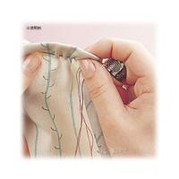 針の頭を指ぬきにあてながら針を持つと、きれいに早く縫えるようになります。フリーサイズ。裏側メッシュ加工で、ムレにくい指ぬき。指に密着しないように裏側をメッシュ加工して、快適な使い心地を工夫しています。針を安心して押せる縁付です。