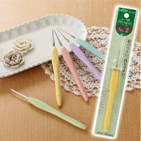 レース針 アミュレ No.2 あみものが大好きになる「編みやすい」「持ちやすい」ずっと編んでいたいレース針です。しっかり編める針先と、やさしい手ざわりで指にフィットする立体グリップ付き。きれいに編める針先です。初心者にも編みやすい針先。ソフトタッチのグリップは、可愛いシャーベットカラーです。編みやすい針先:針先から糸が外れにくく、目を拾ったり糸を引き抜きやすい針先形状になっています。きれいに編める針軸:針の規格を決める針の太さ=d寸法の部分を従来より長くしました。このd寸法の部分を長くすることによって、編み目 の大きさが揃いやすく、きれいに編むことができます。手にやさしい持ちやすいグリップ:立体的なカーブで作られたグリップは、自然と指先にフィットします。しっかり握れるので余分な力をかけずに編むことができ、手が疲れにくい設計です。ソフトですべりにくい素材:より幅広い持ち方に対応できるよう、グリップ全体が、すべりにくい素材でできています。手になじみやすい、ソフトな手ざわりです。