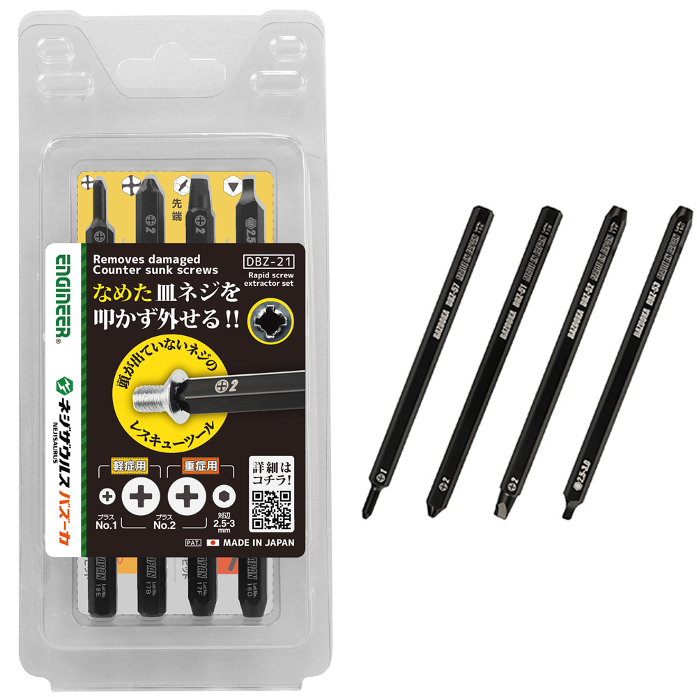 潰れたプラスネジや六角穴付きボルトの取り外しに。独自の先端形状により、潰れたネジを外せます。軽症用ビットは潰れたネジを叩かずに外せます。重症用ビットは潰れたネジをハンマーで叩いて外せます。ブリスターはそのままケースとして使用できます。