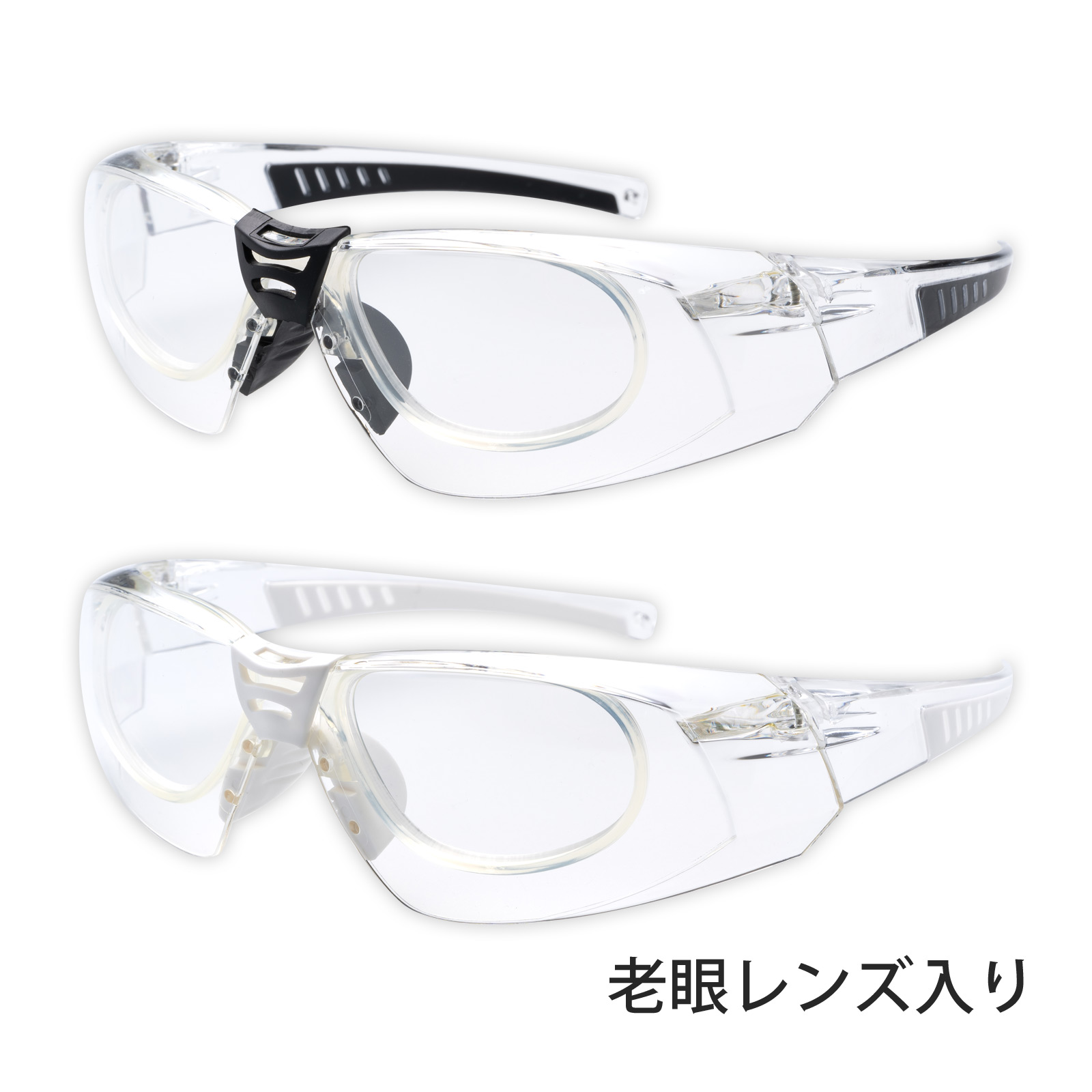 視界がワイドで手元が見やすい!老眼レンズ入り保護グラス。フレームと老眼レンズが別々の構造で、レンズに傷がつく心配がありません。サイズ:内寸142mm×高さ45mm×全長160mm