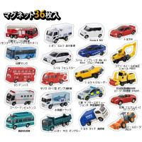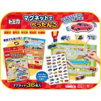 トミカのマグネットボードです。トミカの中でも、子どもに人気の車種を中心に36枚のマグネットが付属しています。定番の働く車(緊急車両、業務車両、工事車両 etc.)から、最近の乗用車まで充実のラインナップです。台紙内面では、トミカのマグネットを自由に貼って、自分だけのトミカの街を作ることが出来ます。交番にパトカーを貼ったり、病院に救急車を貼ったり、働く車を覚えながら楽しめます。裏面は色と形合わせになっています。遊びながら手先の発達を促し、集中力や考える力を養うマグネット遊びですが、繰り返し遊べるので経済的です。子どもが熱中するマグネットは、移動時間や待ち時間の遊びにオススメです。