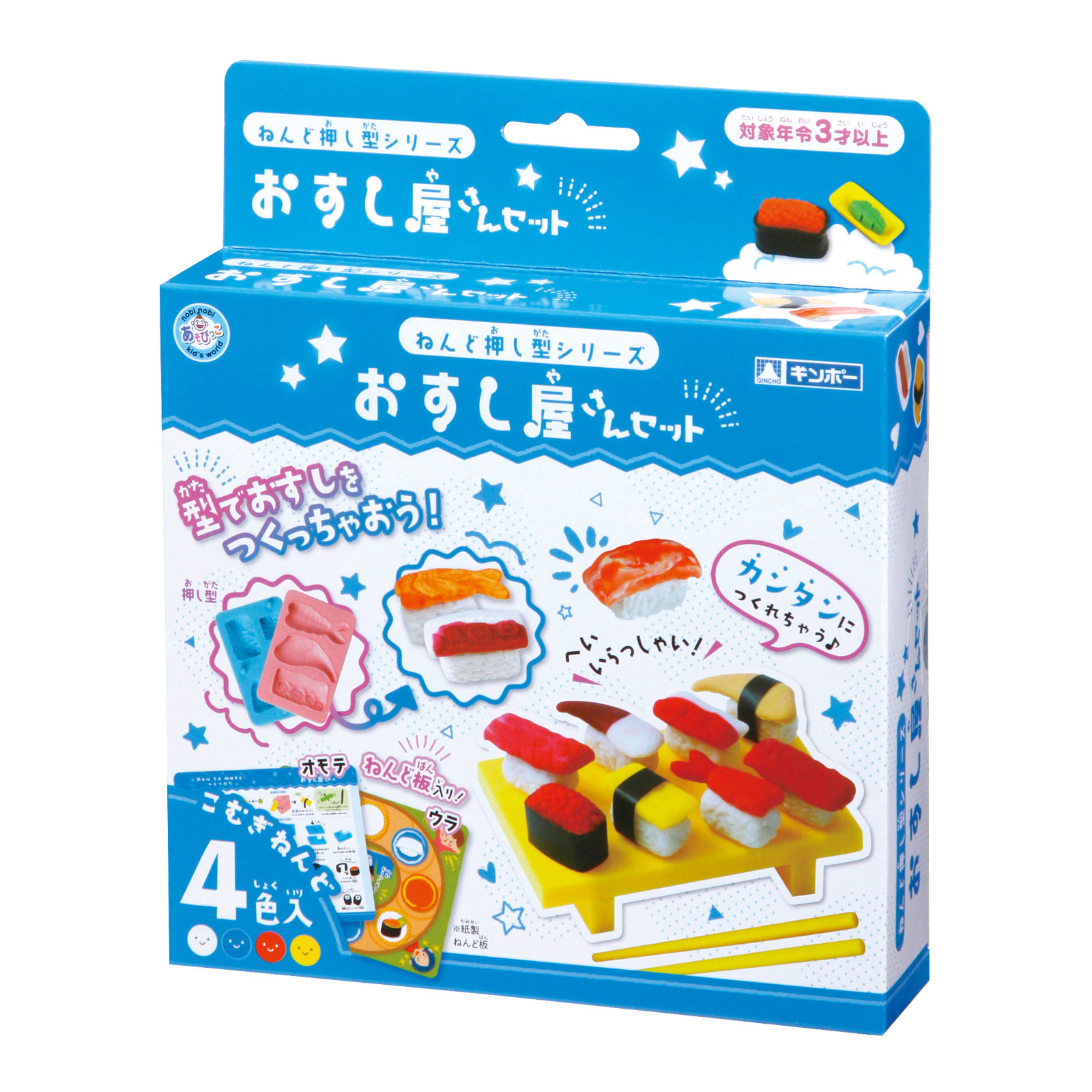 ■内容:小麦ねんど4色(白青赤黄/各30g)・保存袋・紙製ねんど板(両面)・押し型4個・ねんどローラー・すしげた・しょうゆ皿・おはし