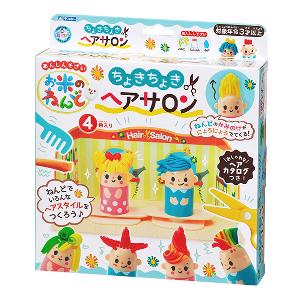 お米のねんどで遊ぶ"ヘアサロン"セットです。押すだけで簡単!人形の頭から粘土がにょろにょろと髪の毛が生えるように出てきます。あっと驚くヘアスタイルのインパクトと、にょろにょろ出てくるユニークさが面白い商品です。 また、ハサミ・バリカン・くしが入っているので、毎回いろんなヘアスタイルを作ることができます。付属のヘアカタログを参考に、家族やお友達と作ったヘアスタイルを見せあったり、ヘアサロンを背景に記念撮影したり..、楽しい遊び方がいっぱい!道具を使うことを覚え、遊びながら発想や工夫の力を養います。