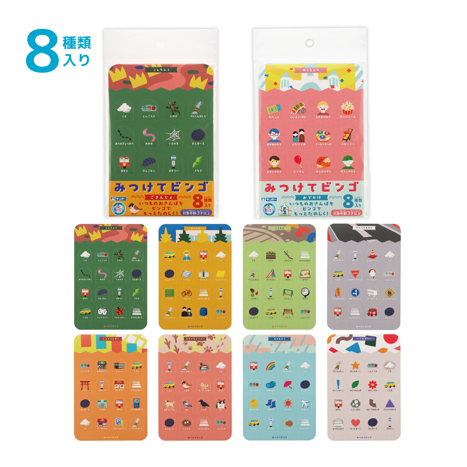 ご近所の散歩道や公園が、「宝探し」の舞台になります!「こうえん」「しょうてんがい」「あめあがり」等、全8種類入り。普段何気なく見ている景色を、見渡してみたり、じっくり観察してみることで、いろいろな発見があるかもしれません。8種類全て違う柄なので、飽きずにいろいろな場所やシチュエーションで遊べます。