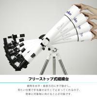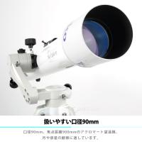 直感的な操作が可能なフリーストップ式経緯台と90mm口径の望遠鏡セット口径90mmの天体望遠鏡と直感的な操作が可能なフリーストップ式経緯台セット。鏡筒は、口径90mm 焦点距離900mmのアクロマートレンズ採用。幅広くご使用いただけるスタンダードな望遠鏡です。月や惑星の観測に適しています。架台は鏡筒を手で動かし離したところで止まる、フリーストップ式経緯台を採用。天体を初めて使用される方でも扱いやすく、見たい星をすぐに導入できるでしょう。三脚も安定性のある2段式ステンレス製を採用。お好みの高さに調整して、楽な姿勢で観測できます。組み立ても工具いらずで簡単にできますので、初めての方でも簡単に組み立てられます。