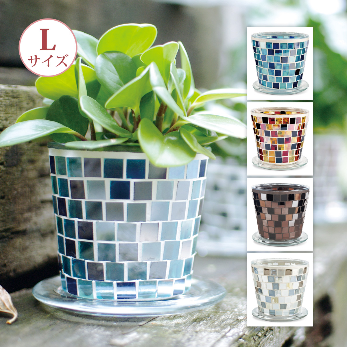 モザイクガラスの透明感が美しい並べて飾りたいプラントポット 職人手作りのモザイクガラスがキラキラ輝く、受け皿付きのプラントポット。大小選べるサイズと形で並べて飾っても絵になります。鉢底には便利な水抜き穴がついています。モザイクガラスの美しい色と形で目を楽しませるカレードシリーズ。角度によって表情を変える色彩豊かなガラスタイルは、日常の風景をほんの少し鮮やかに変えてくれる力があります。