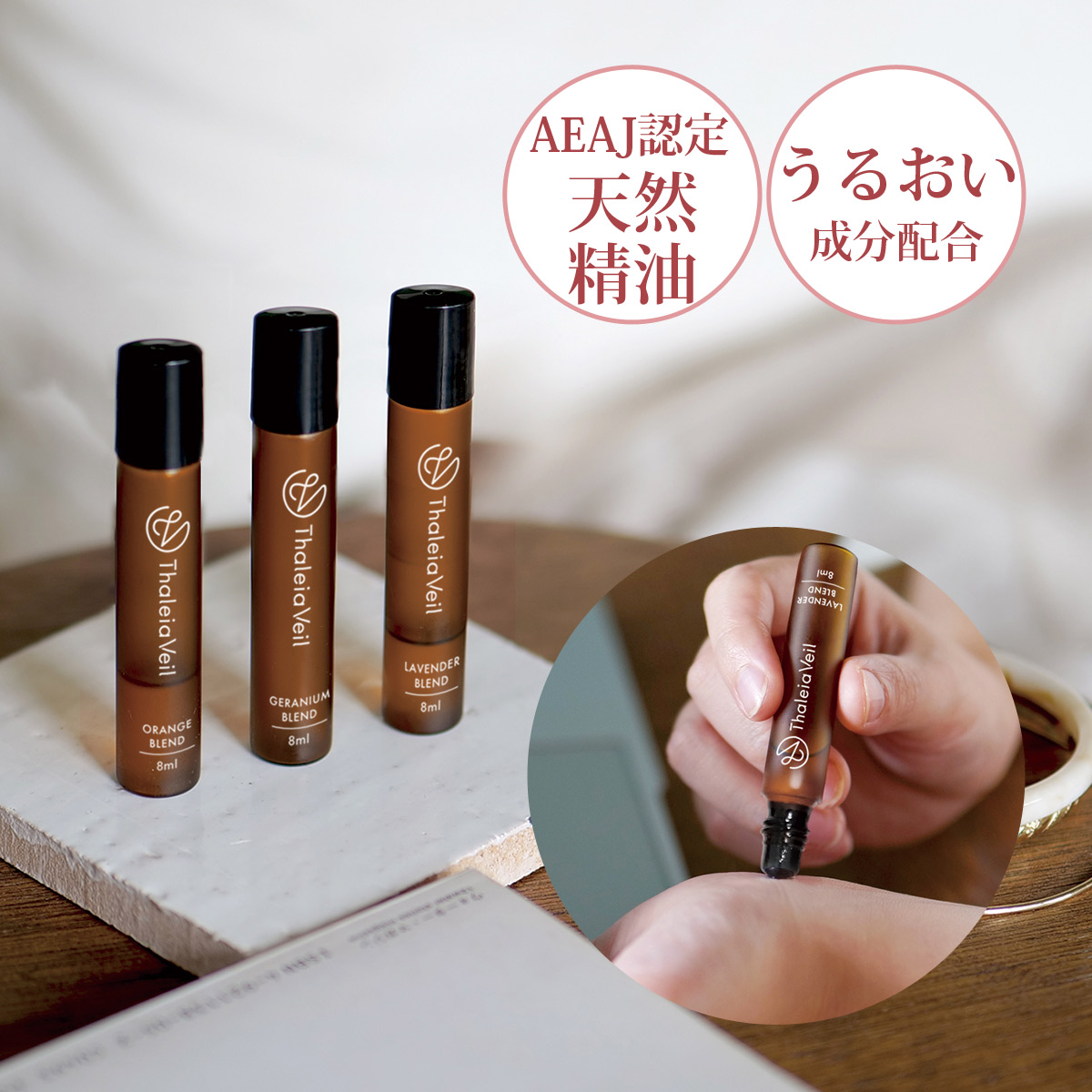 オフィスでの気分の切り替えに、もやもやが晴れる秘密のお守り。リップクリームのような手軽さで、仕事の合間やおやすみ前、お手洗いの後に香りをまとうことができます。ポーチに収まるコンパクトサイズで、首や手首にくるくるするだけで香りを楽しめる、秘密のお守りのような存在です。気分の切り替えや緊張緩和に、ひと塗りで純粋な精油をまとう。Thaleiaveil(サリアベル) ロールオンアロマ。