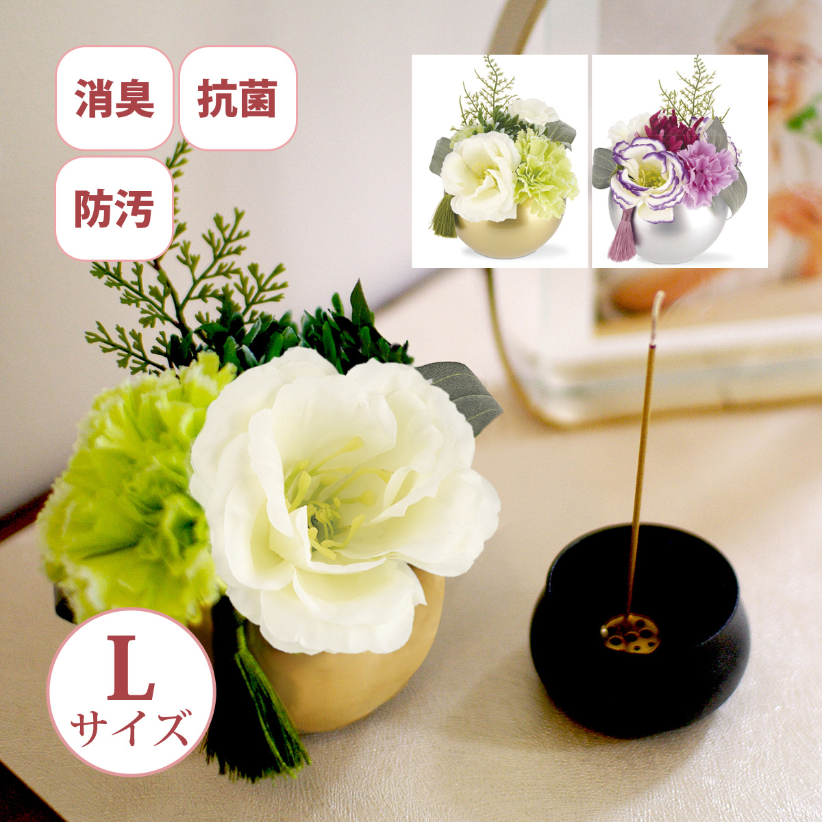 日常的に仏壇のお花を変えるのは手間もお金もかかります。花が枯れやすい夏の季節などは特に「花を絶やさないこと」が負担に感じられるかもしれません。そんな時にアーティフィシャル供花なら水を必要とせず1年を通して枯れることなく常に彩りを添えてくれます。日常は造花をベースとして、命日やお盆などの節目には生花をプラスするなど、供養する方の負担にならずに故人との関係が続いていくことが私たちの理想です。そっと手で包みたくなる丸い形の花器はギラついた反射を抑えた奥行きのある上品な光沢が特徴。幾重にも重なる花びらが美しいトルコキキョウが主役のアレンジメントは、お仏前に故人への深い思いを添えてくれます。