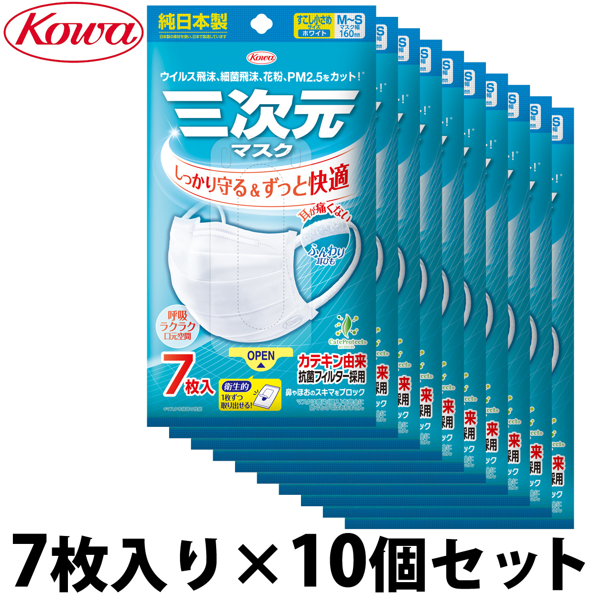 三次元マスク 純日本製 すこし小さめ MSサイズ ホワイト 7枚入×10個セット 興和 マスク 不織布 4層 使い捨て KOWA