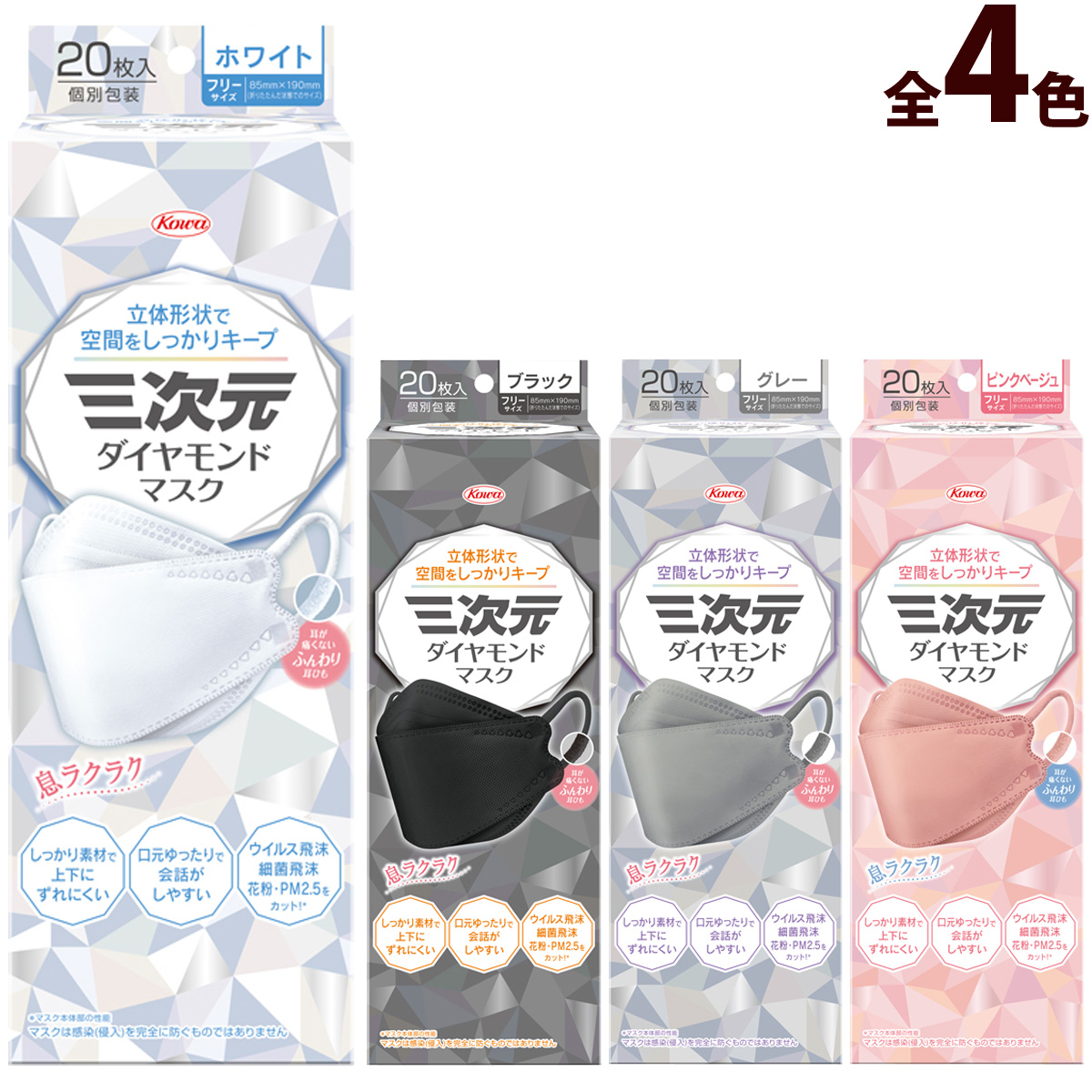三次元マスク 三次元ダイヤモンドマスク フリーサイズ 20枚入 4層 立体 不織布 耳が痛くない 息がしやすい サージカルマスク