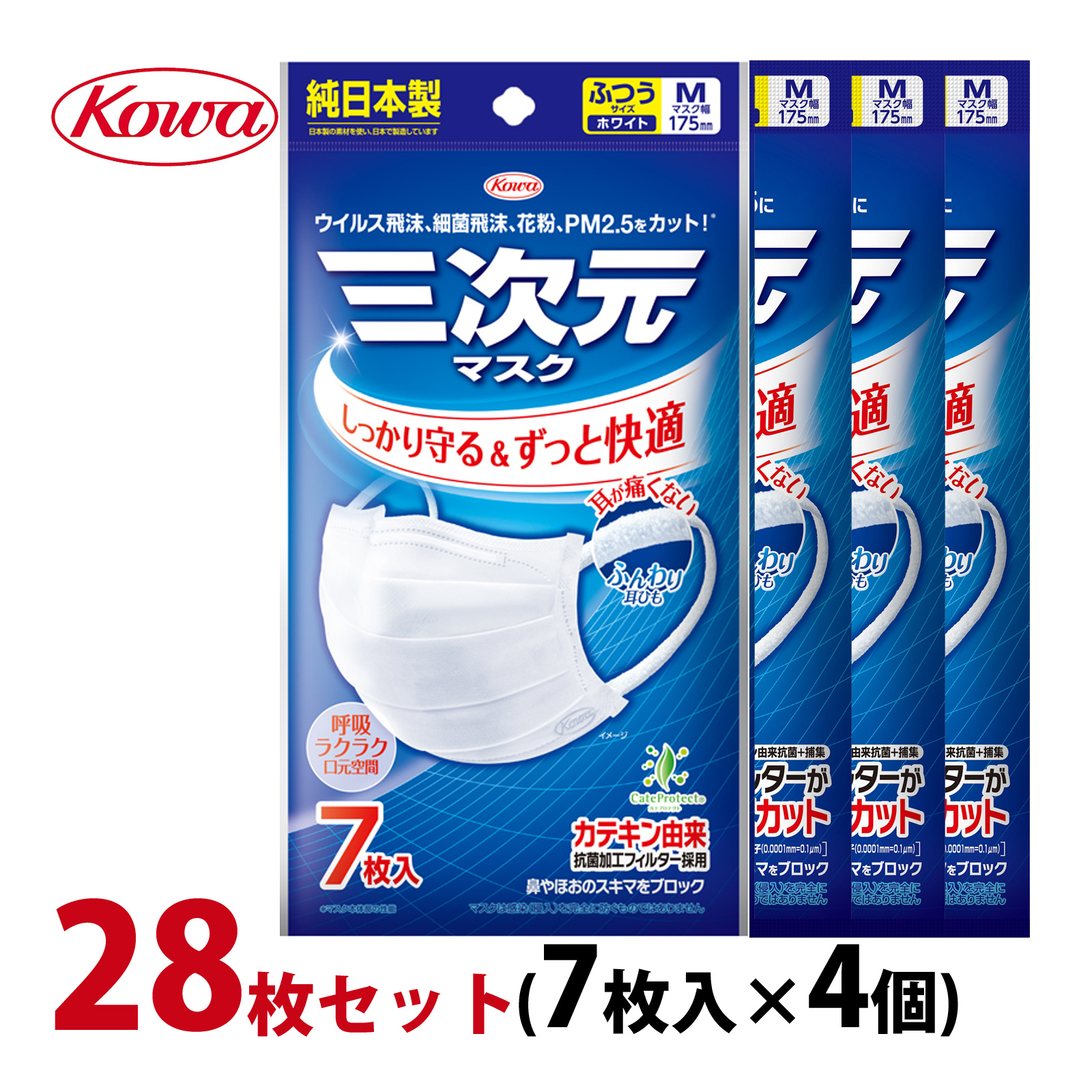 三次元マスク ふつうサイズ 7枚入×4個セット サージカルマスク 不織布 日本製 4層 興和 純日本製 コーワ 使い捨て ホワイト 白 ウイルス対策