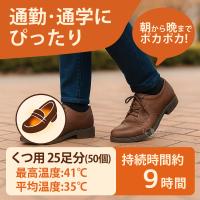 いつでも手軽にぽっかぽか冬の通勤・通学時にいつでも手軽にぽっかぽか。ヤシガラ活性炭入りのくつ用ホッカイロです。持続時間も長〜く、ぬくぬく適正温度が安定的に持続します。持続時間:約9時間