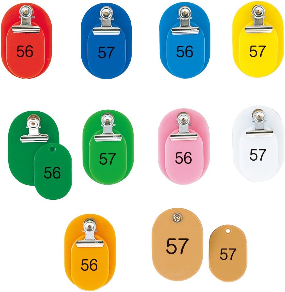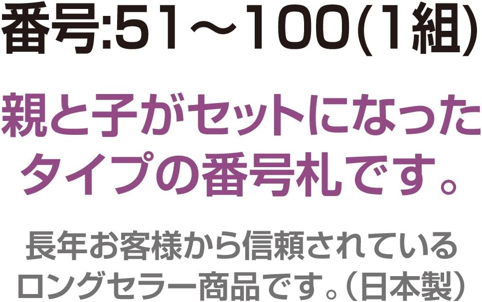 親と子がセットになったタイプの番号札です。 目玉クリップ付 大小2枚組。番号:51〜100(1組)