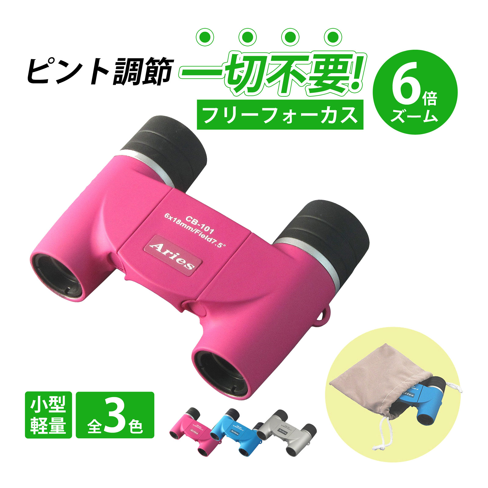 登山、ハイキングにお勧めのフリーフォーカス双眼鏡です。煩わしいピント合わせがいらないので、見たいものを素早くチャッチ。三色カラーからお選びいただけます。倍率:6倍 対物レンズ有効径:18mm