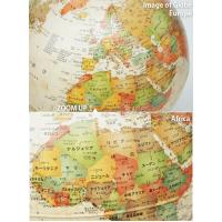 羊皮紙で作られた地球儀をイメージしたアンティーク調の地図です。地図のベースは行政図になります。行政図国ごとに色分けをしている地図。それぞれの国の形・大きさが一目で分かりやすくなっています。アクセサリーの特徴弓型のフレーム(材質:PS樹脂)で球体を支えています。フレームには緯度を調べる目盛がついています。