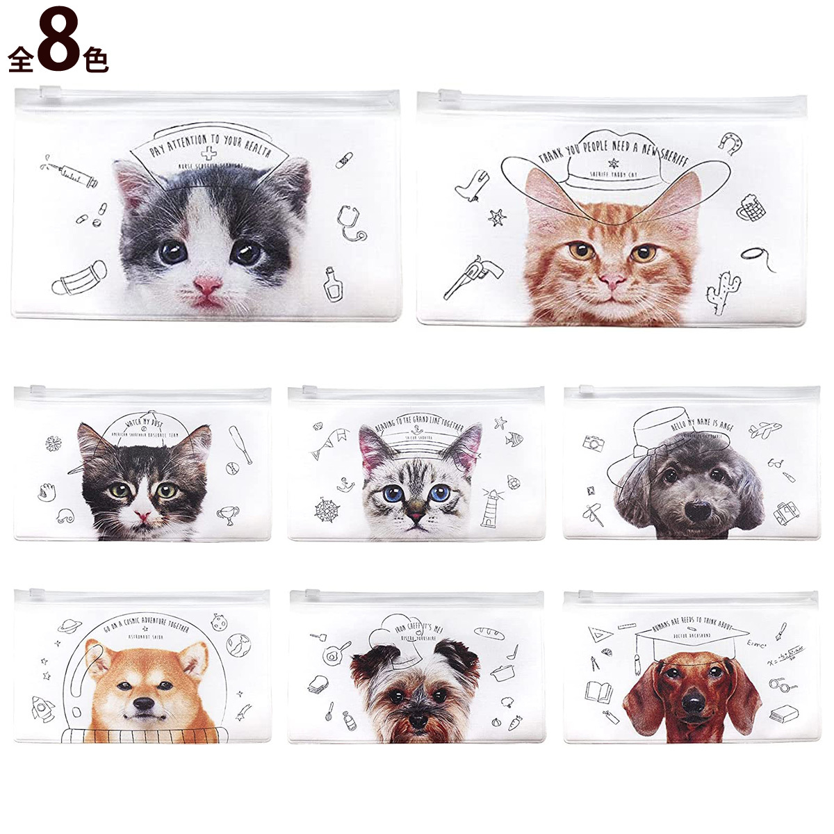 滑らかな手触りの生地に職業ペット達をプリント。癒される動物達を連れてお出かけしましょう。内側に抗菌素材を使用しているので、マスクを清潔に保ち、シールチャックでかさばらずに持ち運べます。マスクは4枚程度収納できます( 不織布マスク175×95mmを基準 )。マスク以外にも、汗拭きシート・歯ブラシ・女性用品等のエチケットアイテムや通帳・パスポート・筆記用具等の文具が入る便利なサイズで、幅広い用途で使えます。※マスクは付属しておりません。