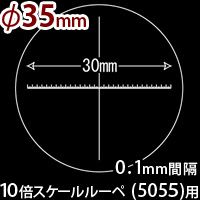 スケールルーペ10倍用(φ35mm)のスケールです。白文字で印刷されいますので、対象物が黒系等の色をしたものを計測するのに最適です。最小メモリ0.1mm